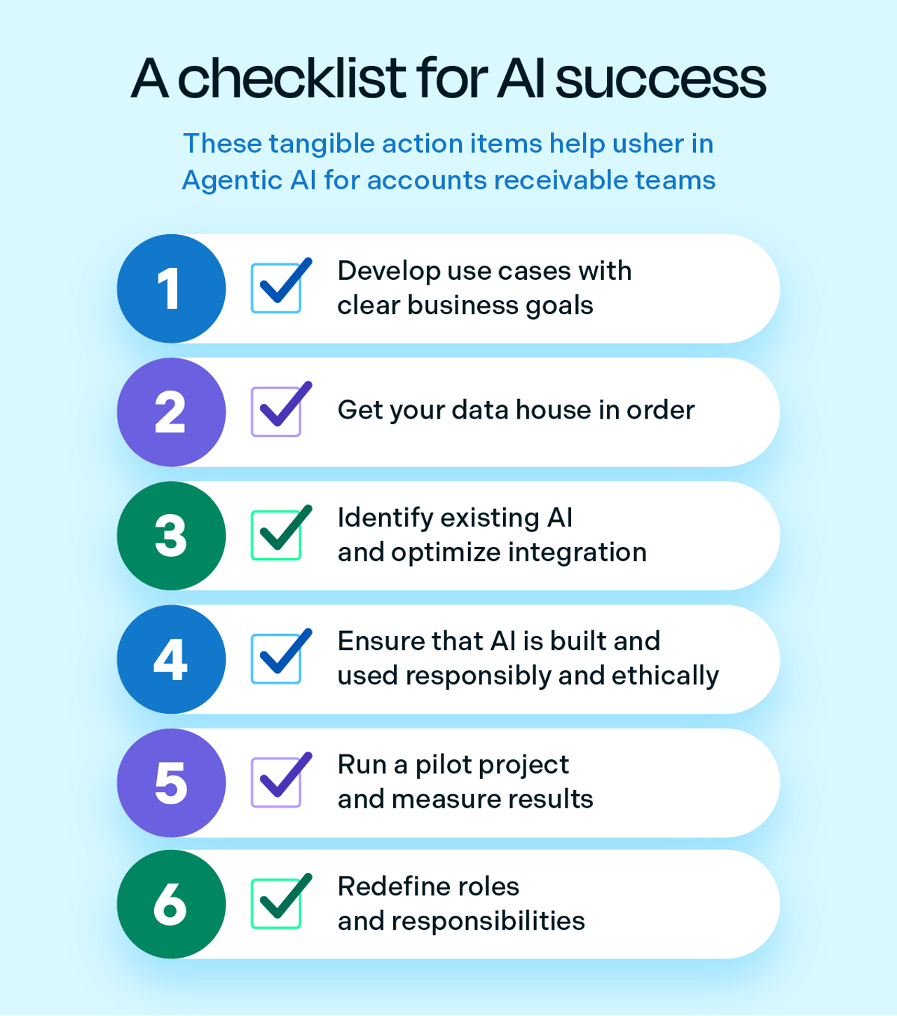 - Ontwikkel use cases met duidelijke bedrijfsdoelen. De grootste AI-successen beginnen met goed gedefinieerde doelstellingen. Welke specifieke uitdagingen in accounts receivable kan AI oplossen? Hoe wordt succes gemeten? Financiële teams die vanaf het begin duidelijke KPI's en financiële impactbeoordelingen vaststellen, zien sneller een echte ROI.